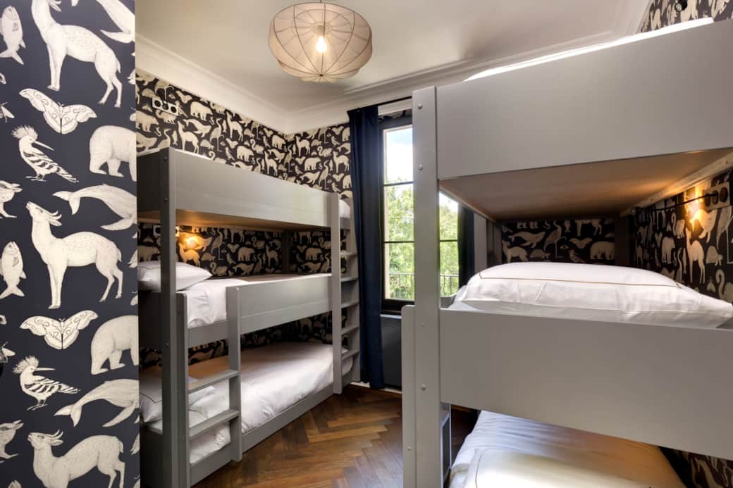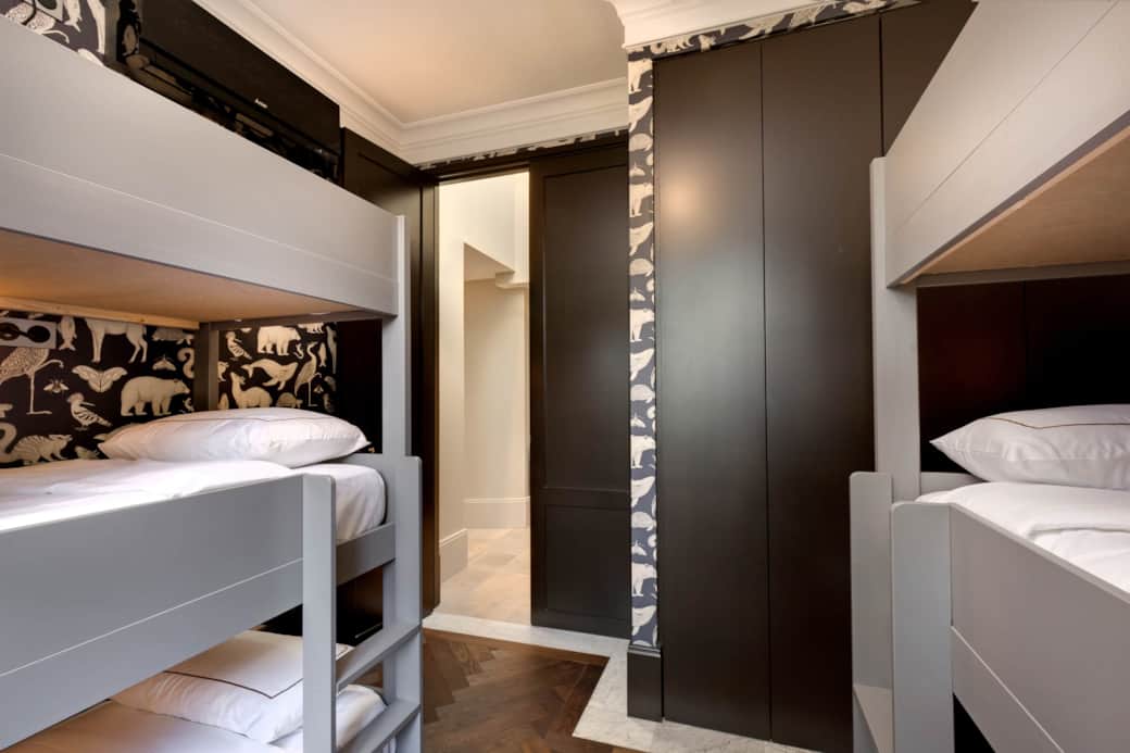 This children’s room features six single beds. It is equipped with air conditioning, a wardrobe, and a desk overlooking the park of the estate. The bathroom, located on the landing, includes a bathtub.